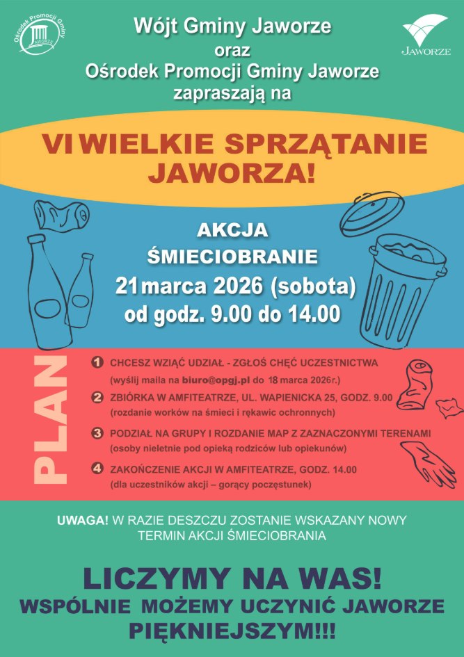 Anna Skotnicka-Nędzka - Wójt Gminy Jaworze oraz Ośrodek Promocji Gminy Jaworze zapraszają wszystkich mieszkańców Jaworza 21 marca 2026 r. (sobota) do wspólnego udziału w akcji "Śmieciobranie".